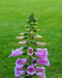 Vingerhoedskruid is tweejarig: jaar 1 vormt een bladrozet, jaar 2 bloeit de plant (juni–augustus) en sterft daarna af. Houd de grond gelijkmatig vochtig, geef in het voorjaar een dunne laag compost, geen zware stikstofgift. In winderige plekken kunnen hoge aren steun nodig hebben. Verwijder uitgebloeide aren voor een langere bloei; laat enkele aren tot zaad rijpen als je zaailingen wilt.